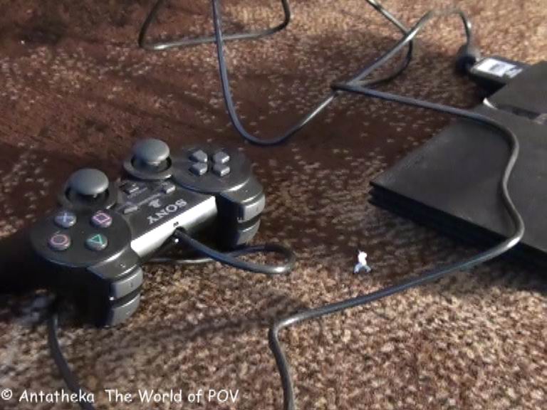While her son was playing with the playstation and her daughter eating some peanuts, a flash appears and all of them shrunk to 1 cm size.