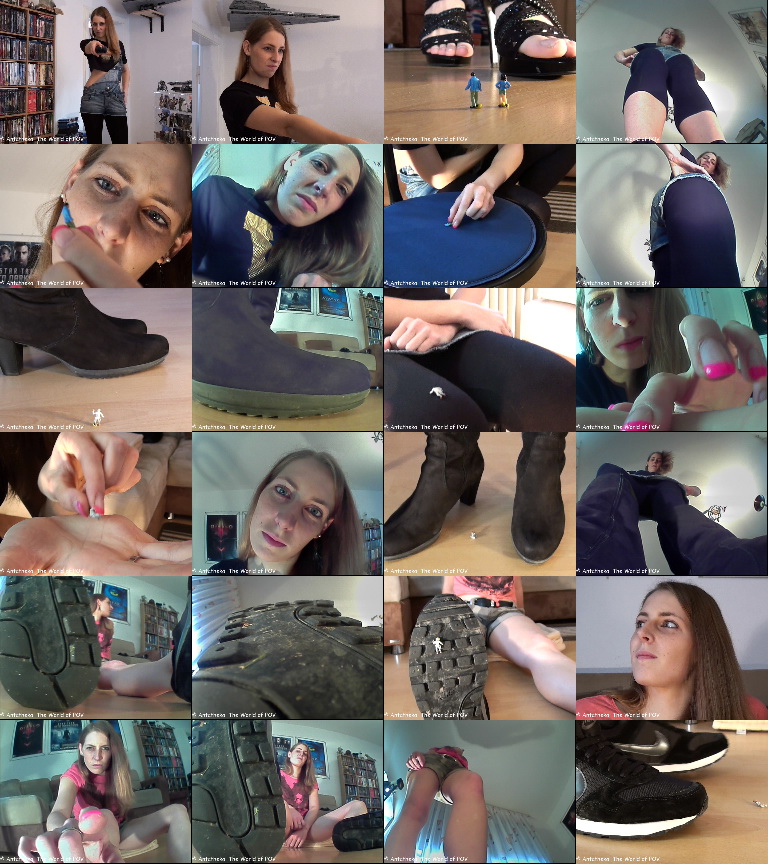 The first collection with our tall model Nady and some shrunken people! A little man climbs up to her knee, but he gets caught and punished. Another little man climbs up the sole of her sneakers. A very bad idea.. In the third movie she shrinks her ex boyfriend and his new girl to have some revenge. Many close ups, great pov views, crush, butt crush and a tall girl - Enjoy! |